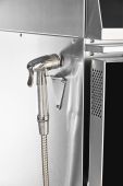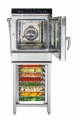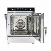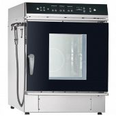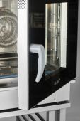 Безопасность персонала усилена благодаря двойному термостойкому остеклению, вентилируемой дверце и двухходовому механизму открывания, снижающему риск контакта с горячим паром. Система «свободные руки» и лоток для сбора конденсата делают работу еще комфортнее.