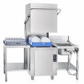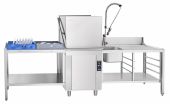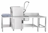 Автоматическое наполнение ванны и поддержание уровня воды сочетаются с постоянным контролем температуры в ванне и бойлере. Машина оснащена двумя режимами мойки, выбор которых осуществляется с кнопочной электронной панели с отображением активной программы и текущих температур. Оборудование совместимо с предмоечными и раздаточными столами указанных серий, при этом возможна установка выходных столов спереди при соответствующей компоновке моечной зоны.