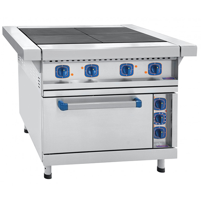 На рабочей поверхности расположены чугунные конфорки размером 300×300 мм. Каждая из них имеет мощность 2,8 кВт и разогревается до +480 °C всего за 25 минут. Семипозиционные регуляторы на передней панели позволяют точнее выбирать режим нагрева, а удобное расположение органов управления обеспечивает комфортную работу повара даже в напряжённые часы.