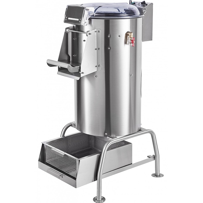 Запуск машины осуществляется поворотом таймера. После завершения цикла выгрузка происходит под воздействием центробежной силы: очищенные клубни направляются в подставленную емкость, а кожура с водой удаляются по сливному шлангу в мезгосборник. Подставка и сам мезгосборник также изготовлены из нержавеющей стали, что повышает долговечность конструкции.