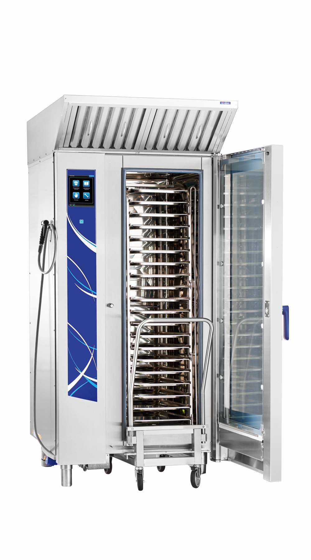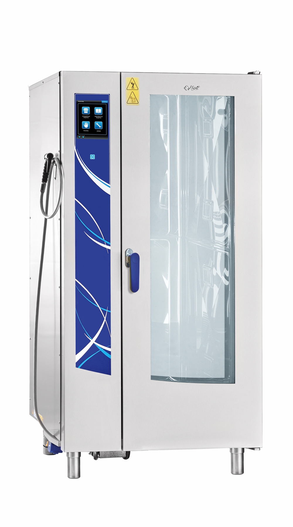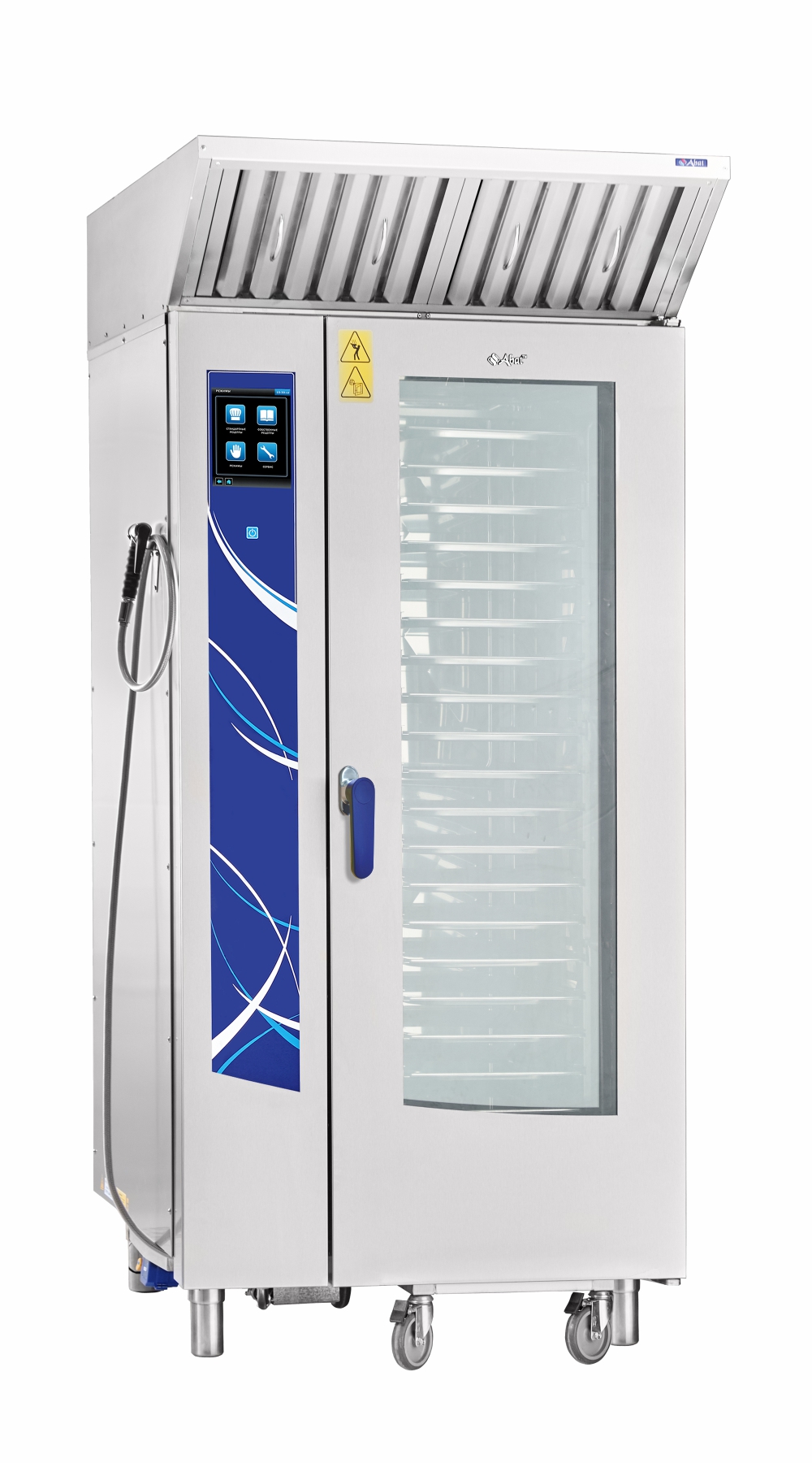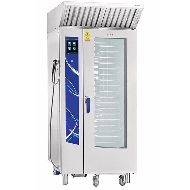 Аппарат оснащен тележкой-шпилькой ТП 20-1/1 под двадцать гастроемкостей GN 1/1. Продольная загрузка совместима также с GN 1/2 и GN 1/3, что делает устройство гибким для разных форматов производства. Сенсорная панель управления с TFT-экраном открывает доступ к 120 встроенным программам и возможности создания до 360 собственных рецептов. Каждая программа допускает до четырёх технологических этапов, а персональные настройки можно защитить паролем.