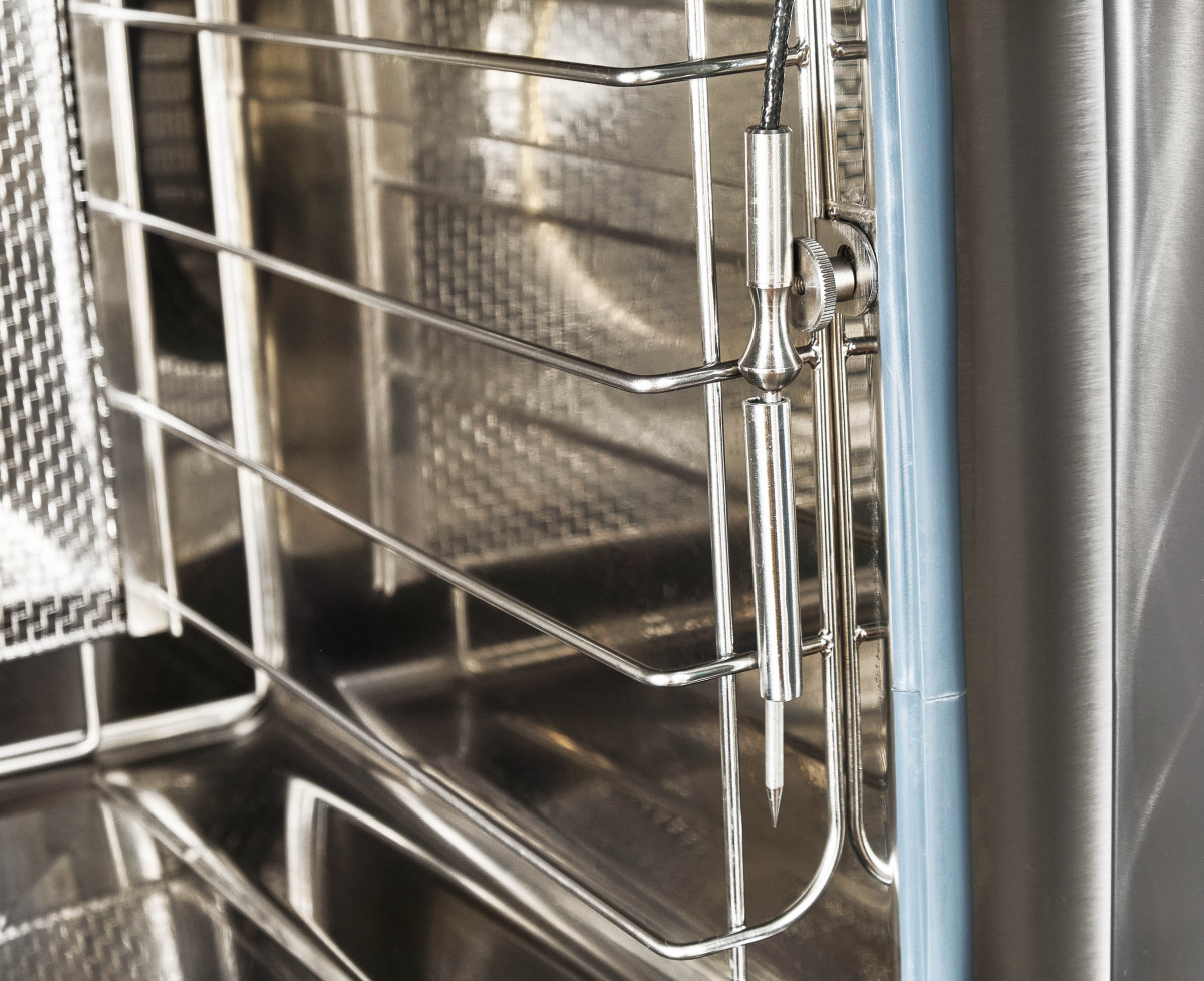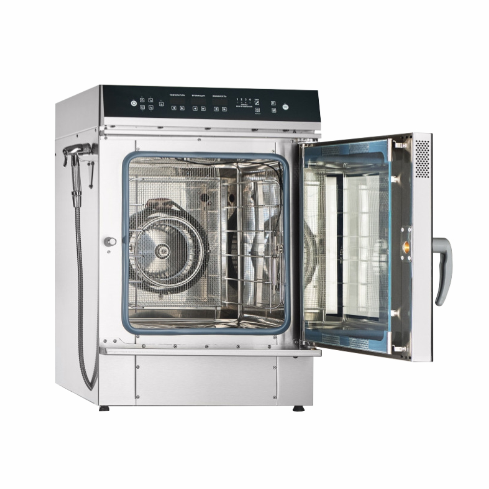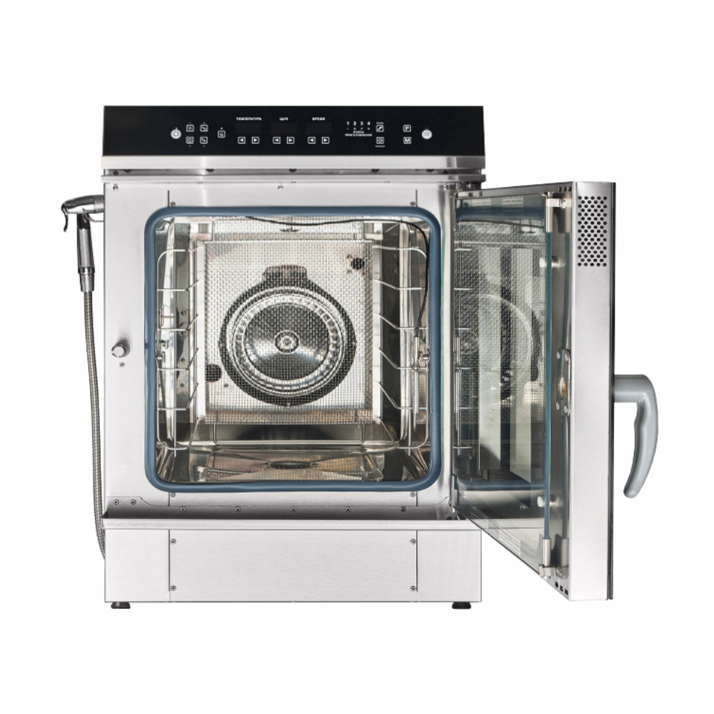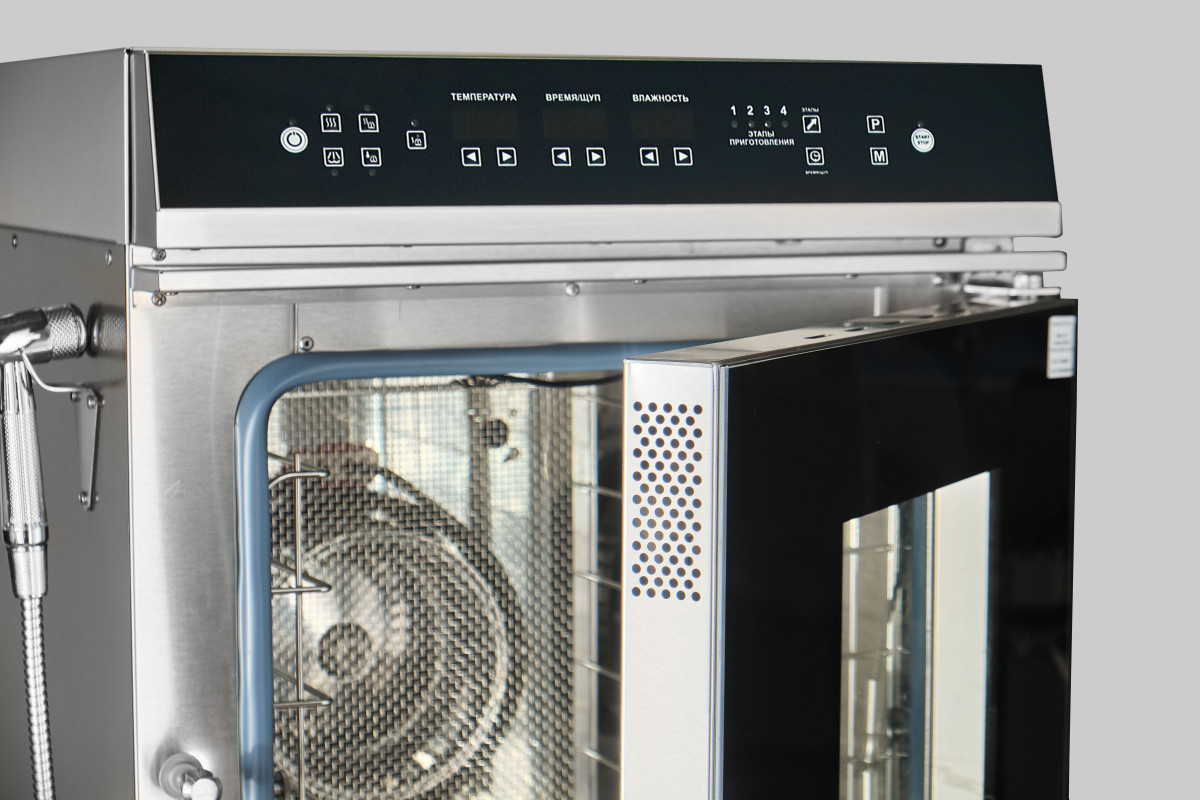 Безопасность персонала усилена благодаря двойному термостойкому остеклению, вентилируемой дверце и двухходовому механизму открывания, снижающему риск контакта с горячим паром. Система «свободные руки» и лоток для сбора конденсата делают работу еще комфортнее.