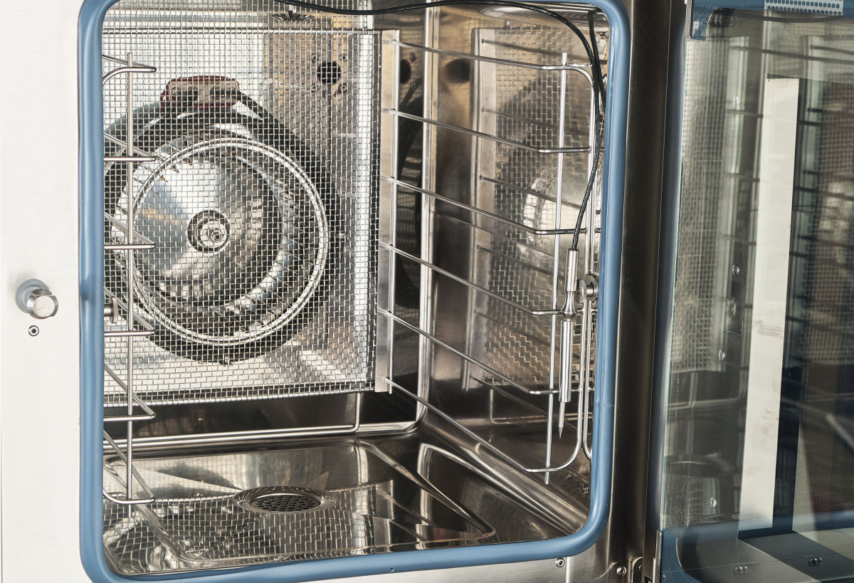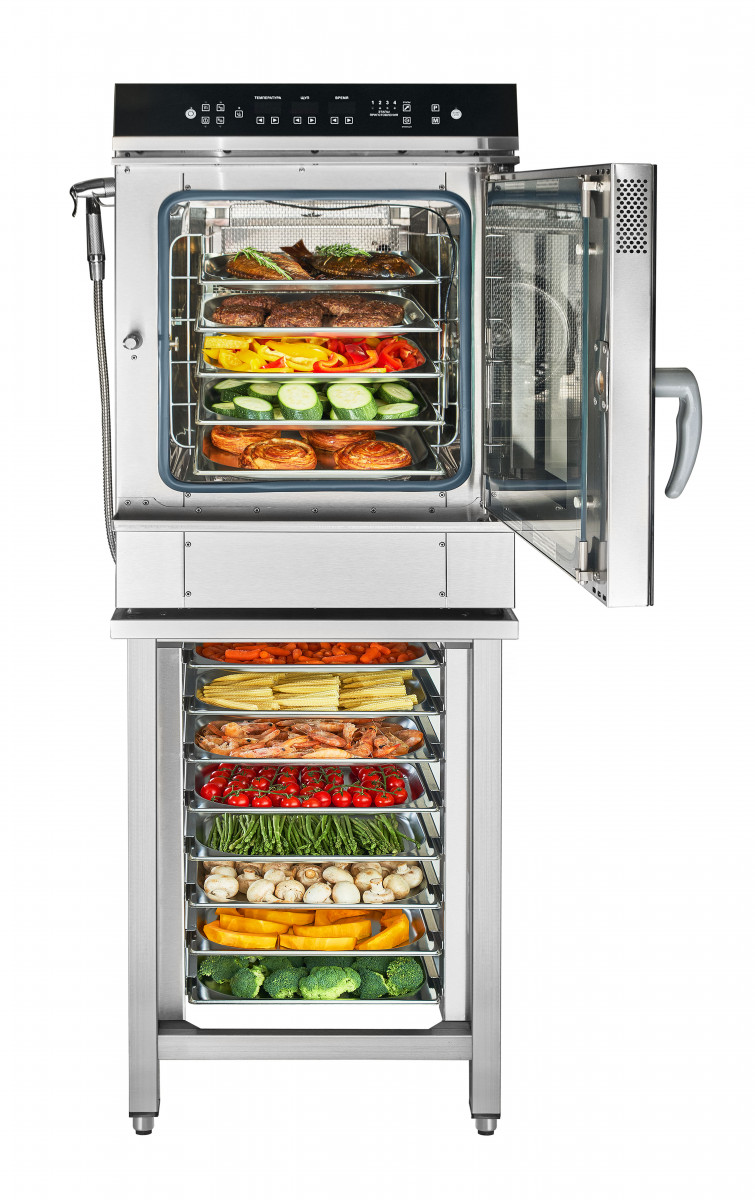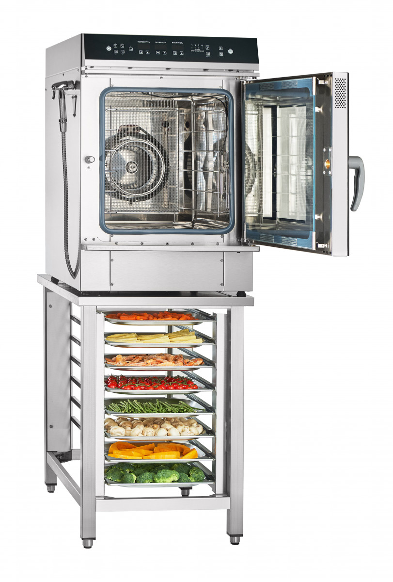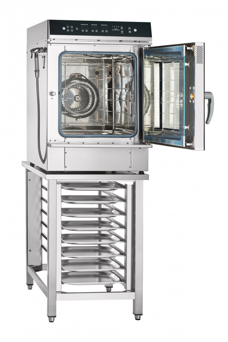 Безопасность персонала усилена благодаря двойному термостойкому остеклению, вентилируемой дверце и двухходовому механизму открывания, снижающему риск контакта с горячим паром. Система «свободные руки» и лоток для сбора конденсата делают работу еще комфортнее.