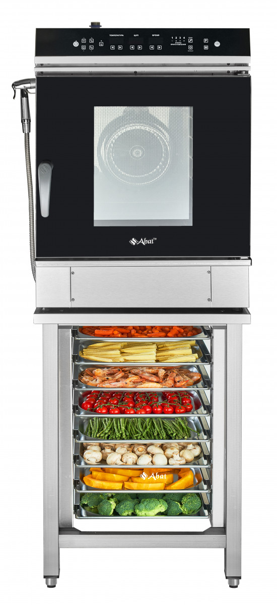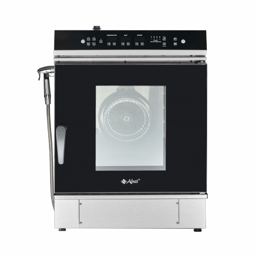 Для ежедневной эксплуатации предусмотрены автоматическая мойка таблетированными средствами Abat, ручной душ в комплекте и камера с закругленными углами, что значительно упрощает уход. ТЭН парогенератора легко очищается от накипи, а внутренняя подсветка обеспечивает контроль процесса приготовления.