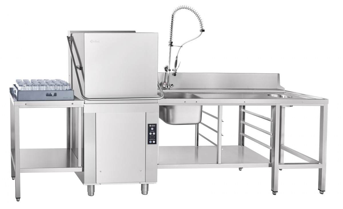 Автоматическое наполнение ванны и поддержание уровня воды сочетаются с постоянным контролем температуры в ванне и бойлере. Машина оснащена двумя режимами мойки, выбор которых осуществляется с кнопочной электронной панели с отображением активной программы и текущих температур. Оборудование совместимо с предмоечными и раздаточными столами указанных серий, при этом возможна установка выходных столов спереди при соответствующей компоновке моечной зоны.