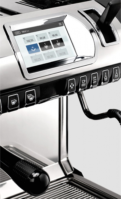 - Индикация активных режимов и функций, текущих даты и времени, температуры напитка и состояния процесса в каждой группе, давления в бойлере и на выходе и других параметров