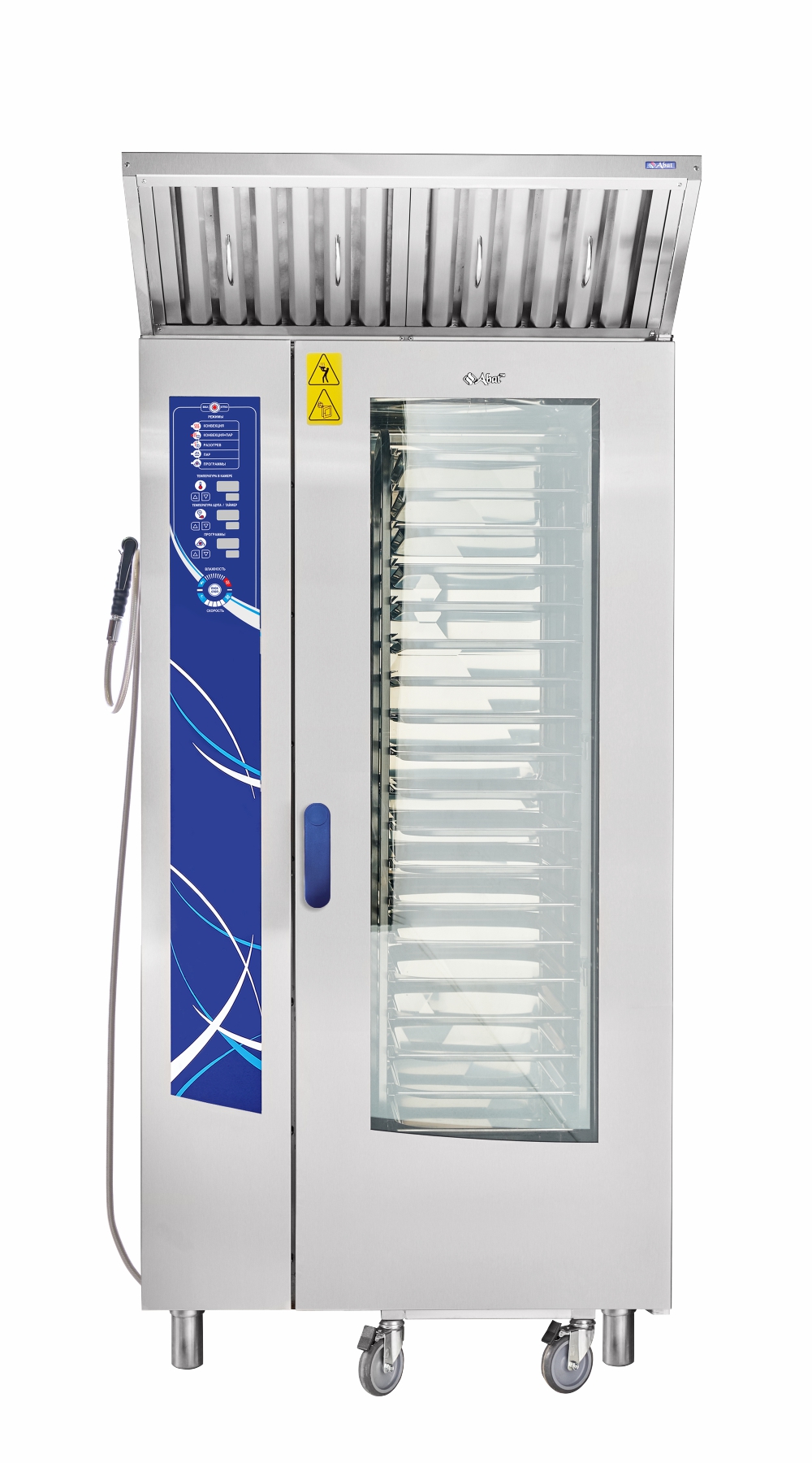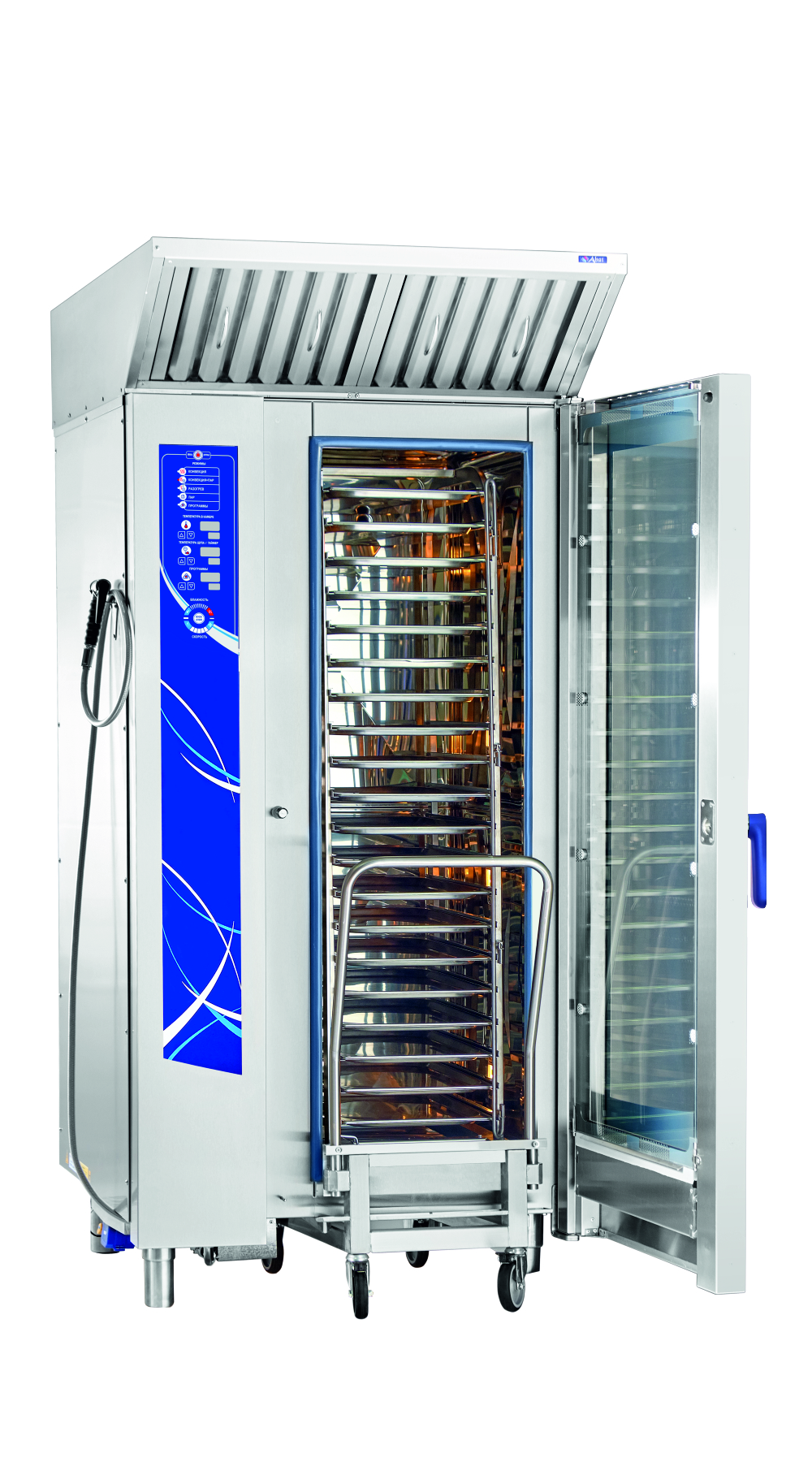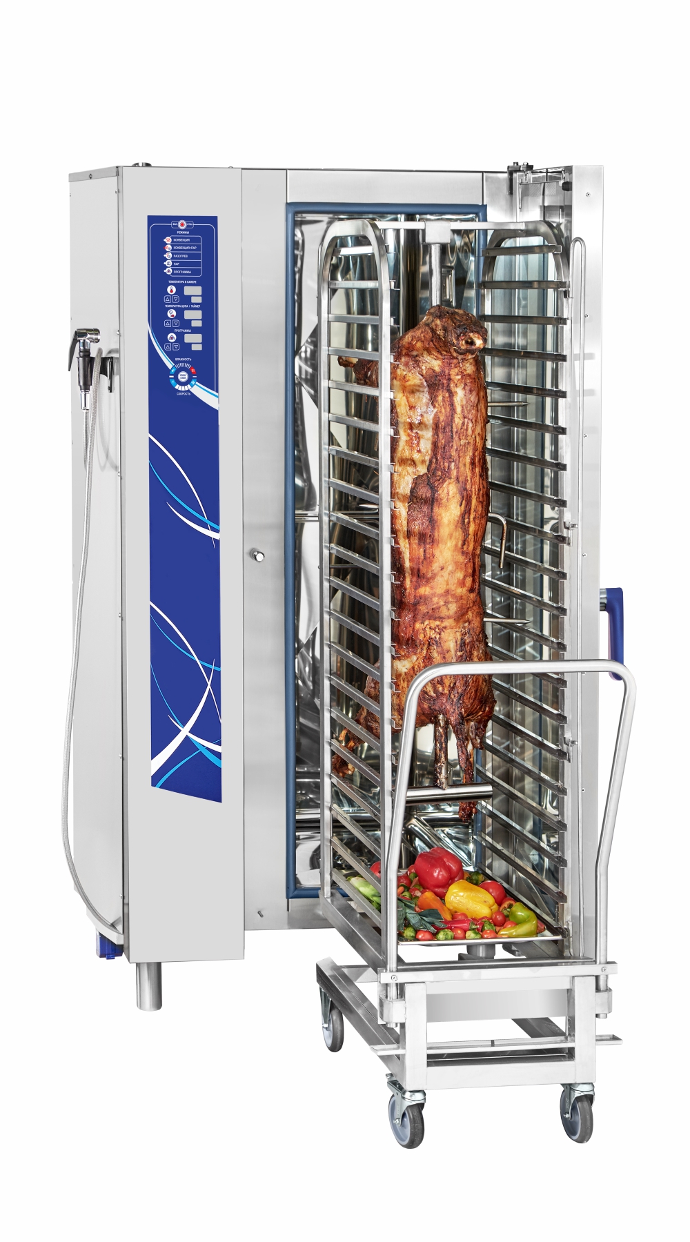 Модель комплектуется тележкой-шпилькой ТП 20-1/1, рассчитанной на 20 гастроемкостей формата GN 1/1. Продольная система загрузки допускает работу с емкостями GN 1/2 и GN 1/3, что делает оборудование универсальным для разных технологических процессов. Панель управления на русском языке с мембранной клавиатурой обеспечивает быстрое освоение персоналом и удобный доступ ко всем функциям.